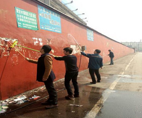 4月9日下午,一号井生产科、机电科、安全科、办公室的广大团员青年开展了义务清除矿井围墙小广告的活动,向“牛皮癣”宣战。