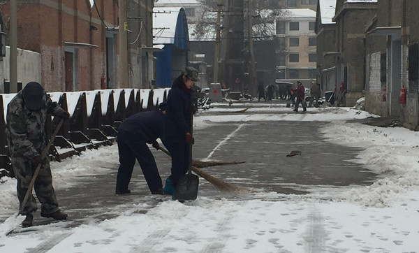 22日一大早,机修厂就组织员工投身扫雪活动中。虽然气温很低,许多人的手和脸都被冻得通红,可是,这一切丝毫没有影响大家的劳动热情和效率。员工们团结协作、井然有序,扫的扫、铲的铲,干得热火朝天,形成了一道美丽的风景线!经过大家的1个多小时的努力,厂区主要入口、主干道等处积雪被全部铲除、扫净,确保了道路通畅,为安全生产和员工出行扫除障碍。