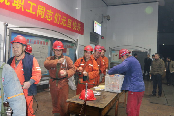 2015年,在集团公司各级领导的关心支持下欢城煤矿顺利完成了年度安全生产任务,实现了安全年。为了感谢全矿职工一年来的辛勤工作和努力付出,2016年元旦零时,辞旧迎新的时刻,欢城煤矿在上井口打出了“祝职工同志们元旦快乐”的横幅,向即将奔赴井下生产岗位的职工送上最真诚的新年祝福。同时为每名职工送上一个又红又圆的“平安果”,祝福全体干部职工同志们在新的一年平平安安。