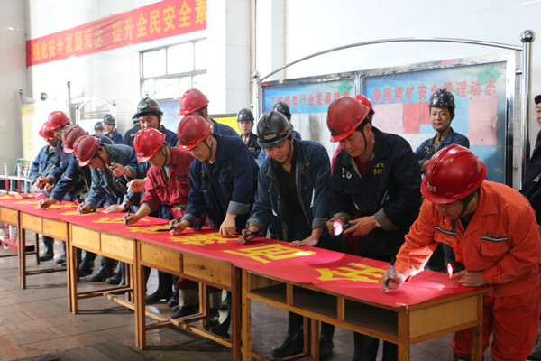 6月7日,欢城煤矿安全生产月活动在“我要安全”全矿干部职工安全签名活动中拉开了帷幕。当天,欢城煤矿矿长仲君下井检查工作,带头在印有第十六个全国安全生产月主题的条幅上郑重写下“落实企业主体责任,保证职工人身安全”的话语并签名。随后,全矿各单位职工踊跃在条幅上签名,以此来表达自己安全生产的决心和信心。整个现场气氛热烈融洽,虽然人员众多,但是由于组织得力,进行的秩序井然,有条不紊。