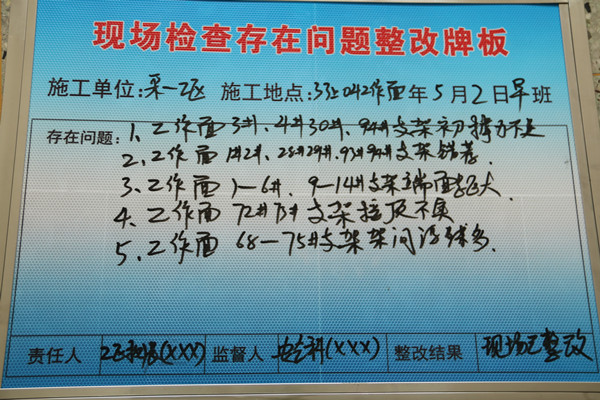 崔庄煤矿质量标准化办公室在安全生产质量常态管理中,结合实际工作,不断创新隐患排查治理模式,在井下各施工地点安设现场检查存在问题整改牌板,将隐患排查工作由单流程变成双流程,取得了良好效果。
