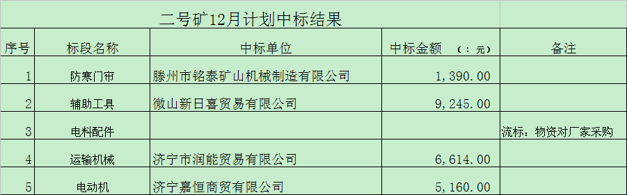 招标结果:微山湖矿业集团(二号井)12月材料采购招标