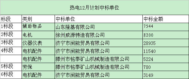 招标结果:微山湖矿业集团(热电厂)12月材料采购招标