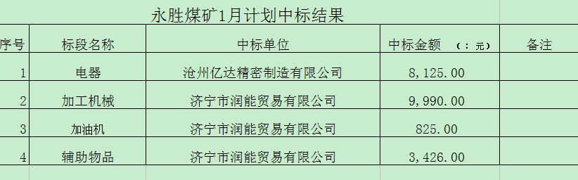 招标结果:微山湖矿业集团(永胜)1月材料采购招标