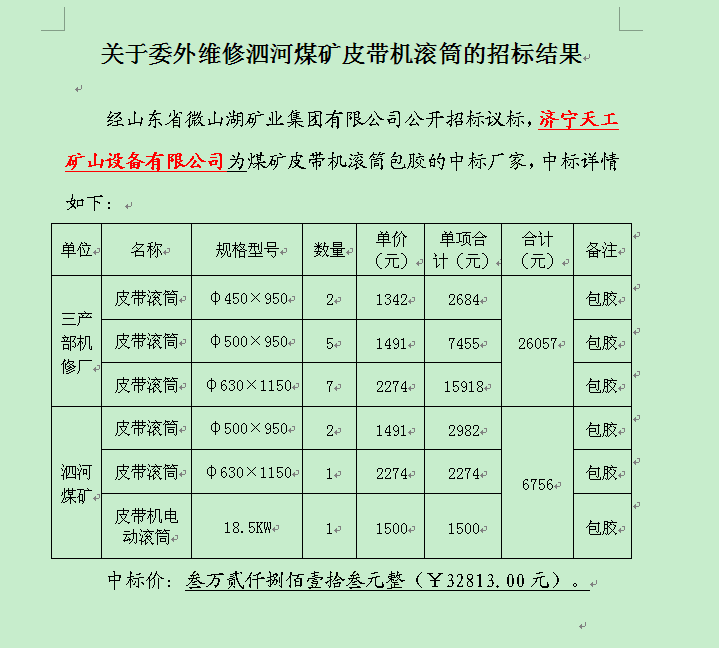 招标结果:关于委外维修泗河煤矿皮带机滚筒的招标公告
