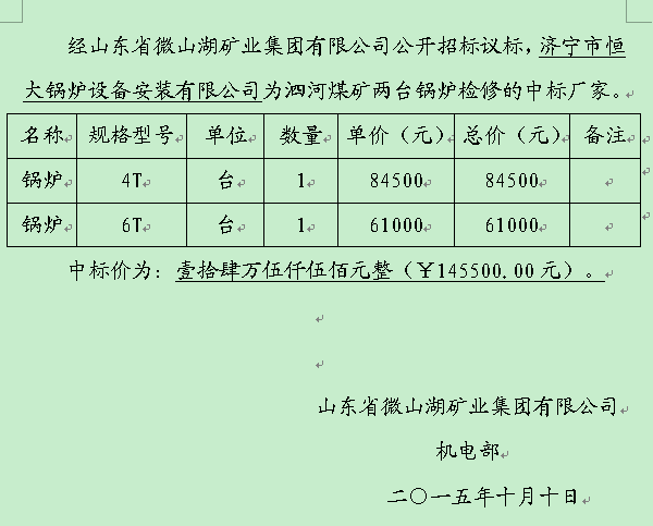 招标结果:关于泗河煤矿两台锅炉委外维修的公告