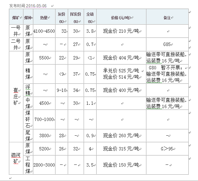 2016年05月05日微山湖矿业集团煤炭价格
