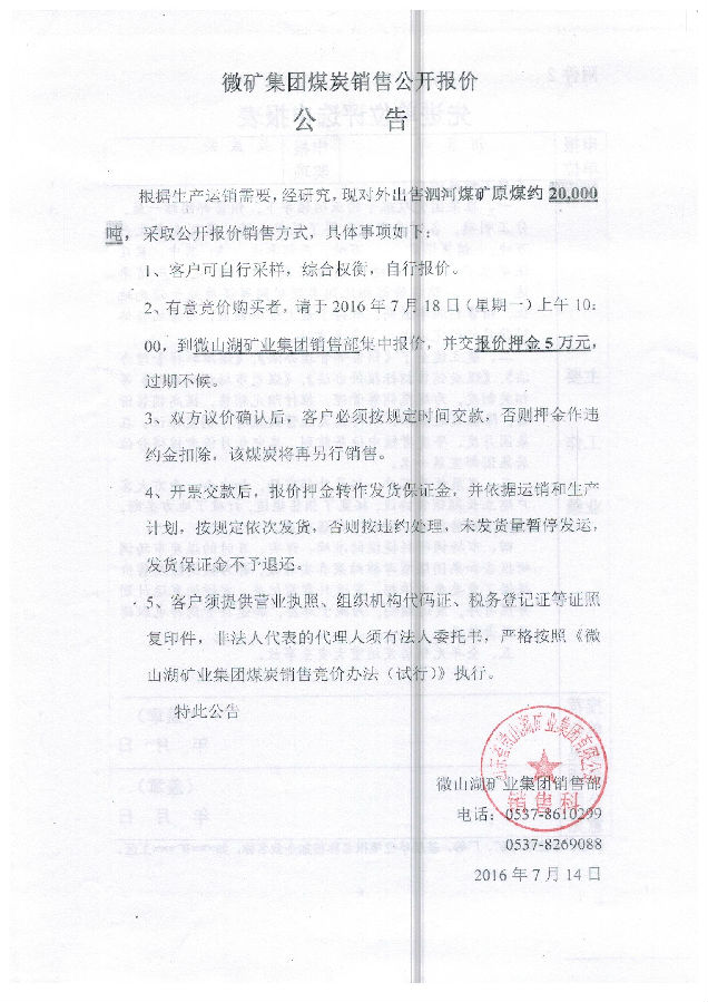 泗河煤矿煤炭公开报价销售公告