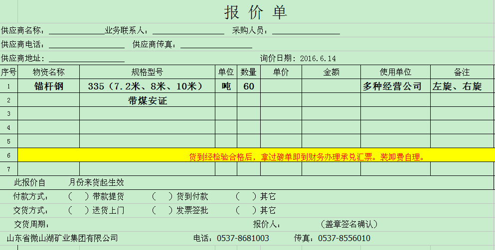 一、招标名称:山东省微山湖矿业集团多种经营公司锚杆钢