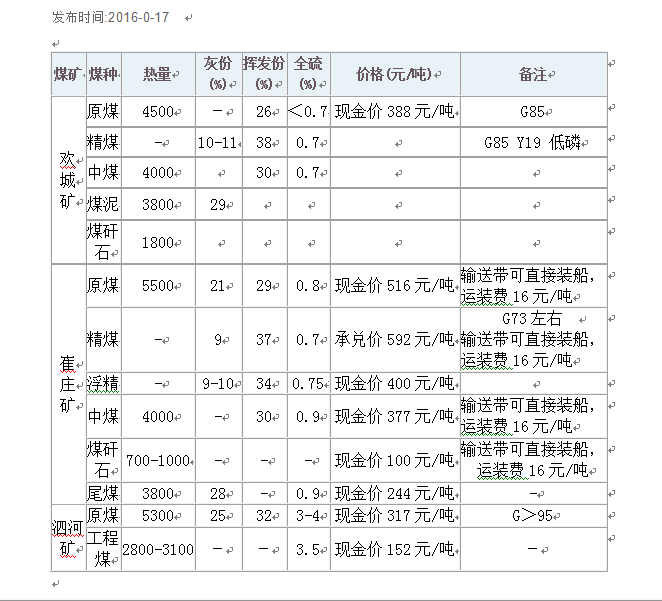 2016年08月17日微山湖矿业集团煤炭价格