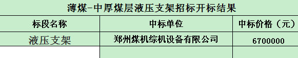 招标结果:薄煤-中厚煤层液压支架