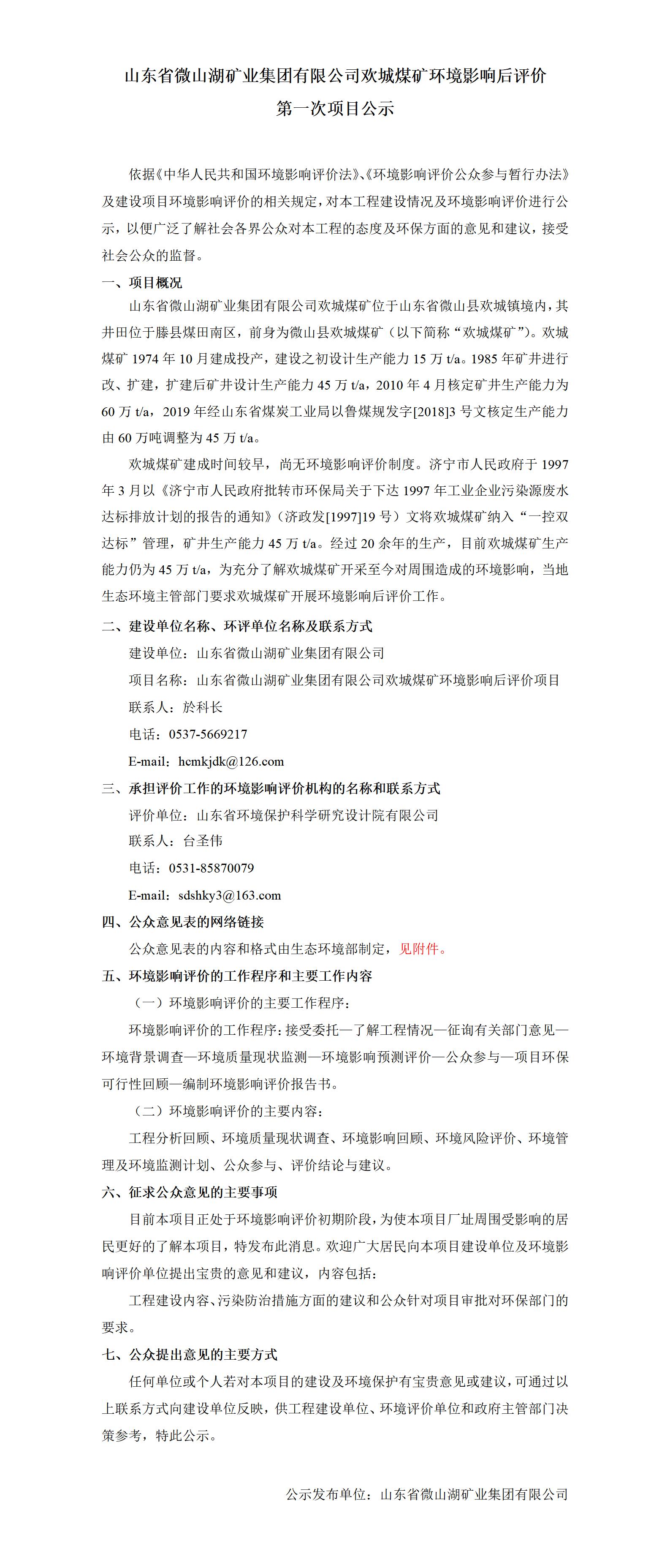 山东省微山湖矿业集团有限公司欢城煤矿环境影响后评价 第一次项目公示