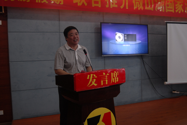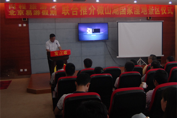 会上,微山县旅游局副局长唐金涛、同程旅游网景区事业部山东区产品总监吴自立、北京易游假期旅行社董事长郭月晨及微山湖矿业集团董事长张长宏出席活动并致辞。张长宏代表微山湖国家湿地景区向莅临此次活动的各位嘉宾表示热烈的欢迎和衷心的感谢。张长宏指出,当前人们对文化生活的追求不断提高,生态旅游已经成为旅游的新热点。微山湖国家湿地景区是亚洲最大的草甸型湖泊湿地,2013年微山湖国家湿地公园入选“中国十大魅力湿地”,是微山湖区唯一获批以“微山湖”命名的国家级湿地公园,景区珍稀原生态动植物物种丰富,生态系统完整,水草丰美,鱼鸟众多,运河文化,渔家风情,综合了天然的野趣与柔情,是人们的精神家园,修身养性的乐土,在这里可充分体验人与自然的和谐相处。此次活动将助推微山湖国家湿地景区与同程旅游网、北京易游假期及各大旅游景区、旅行社加强沟通交流,做好资源共享,实现合作共赢。