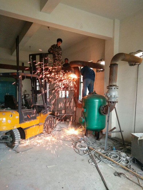 机修厂第一次尝试安装,虽然中间会有难题,但是员工们心往一处想,劲往一处使,困难都迎刃而解。热力交换机组超宽、超重,而且供热站的门比较窄,导致无法进入,也不可利用起重设备,只有分体进入,因整体机组、管道、阀门、法兰盘很多,水密要求很高,不准渗漏还得抗压,如有渗漏,一次试压不成功,还得再次试压,既浪费时间,又浪费水资源,还耽误供暖时间,这样就要求紧固螺栓,必须锁匀、锁牢,胶垫垫正,确保一次试压成功。机组安装完毕,找好水平线,接下来就是重中之重,管道的敷设与焊接,认真规划管道的路线,做到既节约管材,还根据房屋的结构便于吊挂,保证外观整齐、美观。面对室内无法使用起重设备,所用管材都是无缝管,又重又粗,有些地方由于空间有限,叉车无法进入,工作人员经过商讨,自制三角架解决此问题,确保安全的情况下,大大提高了施工进度。机组工作压力很高,对焊接技术要求高,在确保无渗漏情况下还得抗压,工作人员采取加大坡口,加厚焊缝,增加焊缝的抗压能力。为了加快进度,我们采用两点同时施工,中间对接,要求工作要细,细到一个接头、一个弯头,接头要正,弯头、法兰角度之差不得超过±1°,利用水平、垂直线,准确计量尺寸,确保一次对接成功。经过试压检测,正常运转,无任何异常。管道包装也已即将竣工。