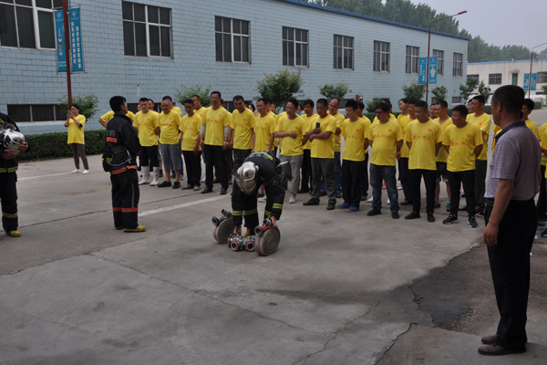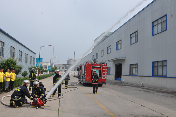 接下来演练又模拟了厂区包装车间发生火灾险情,随着消防警报响起,应急队员根据各自所在位置寻找最近的消防逃生通道有秩序的逃离至空旷地点集合。与此同时,受邀前来的县消防中队官兵迅速安装水带水枪,并铺设移动水炮,举高喷射消防车升起臂架,三管齐下对车间着火点进行喷射灭火,经消防官兵全力抢救,短时间内成功扑灭“火情”,整个灭火演练过程紧张而有序。