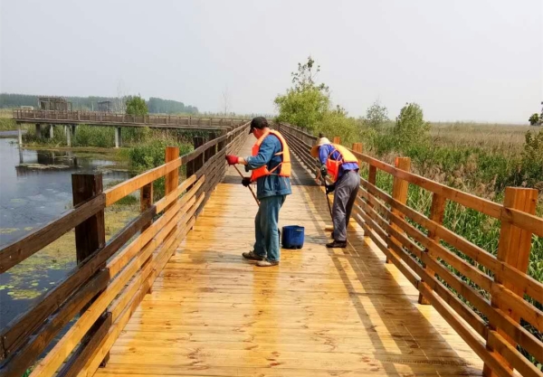 为确保在考察团来到之前完成修复工作,时间紧、任务重,因湿地码头距离工作现场较远,各种材料和工具只能人工运到目的地。由于高楼湿地景区木栈道因火烧的原因,损坏的部分有些严重,他们按照湿地公司要求,克服天气变化、阴雨大风等不利条件,刷漆的刷漆、修复的修复,参战人员分工明确,顶风冒雨,只有埋头工作,没有一句怨言。经过大家的共同努力,提前一天完成工作任务,为考察团到来宣传报道湿地的整体形象,打造最美湿地创造了条件。
