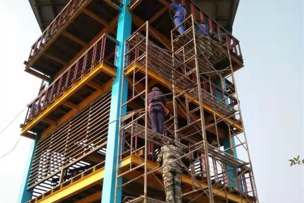 接到任务后,机修厂面对该工作为高空作业,多次组织技术人员实地勘察制定方案,组织人员进入施工现场。针对微山湖湿地公司望湖塔为钢木混合结构,整体高度超过10米以上,需要施工的工作面都属于外跨结构,防锈刷漆工作量及难度比较大。在制定方案的时候,采取整体搭钢架施工的方法既安全又方便,但是此方法需用资金数万元左右,鉴于目前集团公司的资金压力较大,精密制造公司根据三产部要求,在确保安全的情况下尽量减少开支,做到节支降耗、降低成本,制定了切实可行的施工方案,采取先内后外顺序,尽量在整体结构内部解决。确实无法解决的剩余部分,采用焊制的脚手架与主体钢架紧密连接的方法除锈刷漆。