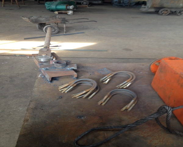 煤矿井下吊挂水管用U型卡使用量较大,但机厂现用U型卡加工方式费时费力,效率较低。矿机厂积极想方设法,着手研制U型卡加工器,以提高劳动效率,减轻劳动强度。经过多次反复试验和改进,新研发的U型卡加工器于2014年10月27日顺利通过了测试并投入使用。