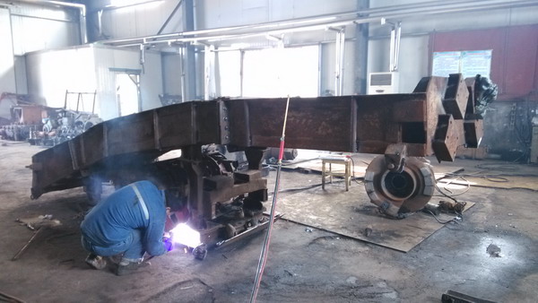 一号矿原耙装机跟矿车出渣,正常使用巷道高度不低于2.2米,现开采的12煤为薄煤层,煤层低,采用皮带跟耙装机作业方式,皮带机尾较低。因此原耙装机无法在低巷道内使用,需更换新的耙装机。经市场调查,购买新设备费用过高,本着节能降耗的原则,矿领导要求机修厂对原耙装机进行改造。
