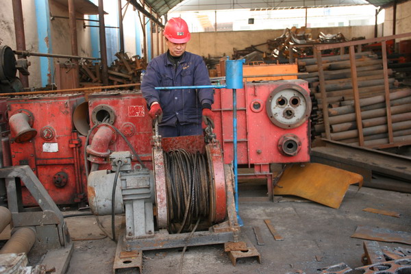 为克服这一难题,机修厂想方设法设计制作了“绞车自动加油器”,就是在绞车旁立一个油瓶样的小桶,在小桶下端连接一个横向输油管,末端封闭,在输油管下面打上均匀的细孔,在输油管靠近油瓶处安装一个控制开关,当绞车司机看到钢丝绳缺油时,就打开控制开关,让油顺着输油管均匀地滴到绞车的钢丝绳上。